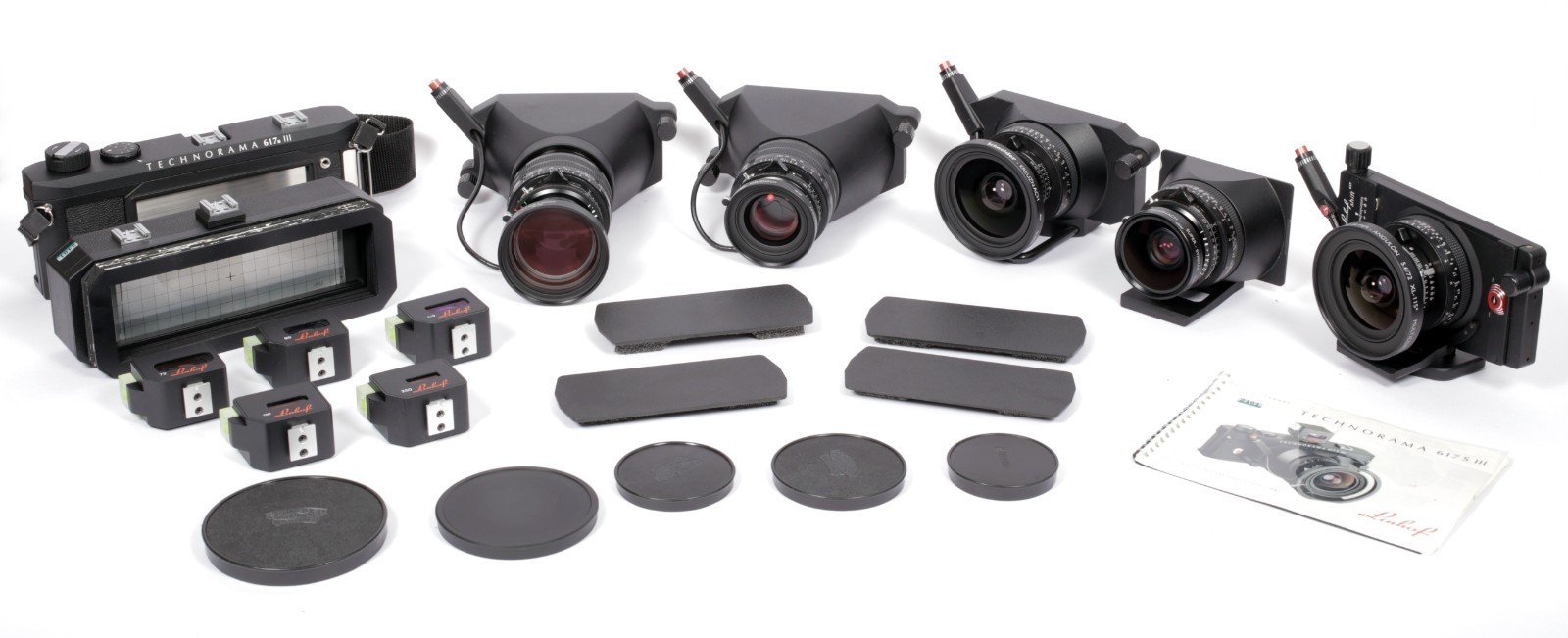 Once in a lifetime chance to buy a comprehensive Technorama kit with 5 lenses, finders, viewing back, strap and a shift adapter. This kit is ready to go out of the box, with the best possible lenses, that are as rare as can be.